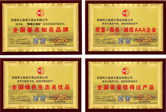 現(xiàn)公司榮獲國家級多項(xiàng)榮譽(yù)稱號:國家級品酒師、國家AAA級誠信體系認(rèn)證、全國生態(tài)名優(yōu)產(chǎn)品質(zhì)量等證書、“散酒王酒業(yè)”獲得“中國著名知名品牌”、品質(zhì)由PICC中國人民保險(xiǎn)公司授保等榮譽(yù)……